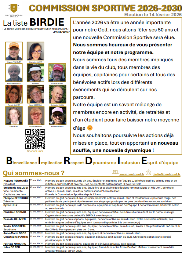 Nous avons transmis le 30 décembre 2025 à la direction du golf, notre liste finalisée avec ses 11 membres, ainsi que notre projet de programme pour validation :